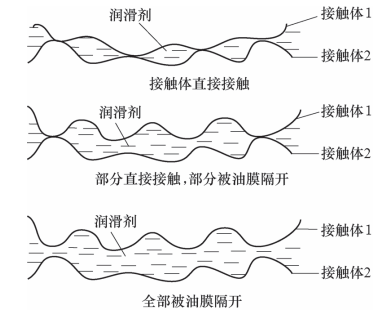 由圖1可以看出,隨著速度V的增加,摩擦因數(shù)具有先下降后上升的趨勢(shì),這是因?yàn)樵诟咿D(zhuǎn)速下形成的潤(rùn)滑油膜厚度更大,潤(rùn)滑油膜厚度的增加使膜厚比發(fā)生變化,進(jìn)而使接觸面潤(rùn)滑狀態(tài)發(fā)生變化,變化情況如圖3所示。隨著轉(zhuǎn)速的增加,潤(rùn)滑狀態(tài)的變化過(guò)程為:邊界潤(rùn)滑→混合潤(rùn)滑→彈流潤(rùn)滑。這樣接觸面上摩擦情況的變化過(guò)程為:接觸體直接接觸產(chǎn)生的滑動(dòng)摩擦→部分滑動(dòng)摩擦部分潤(rùn)滑粘滯摩擦→潤(rùn)滑粘滯摩擦。