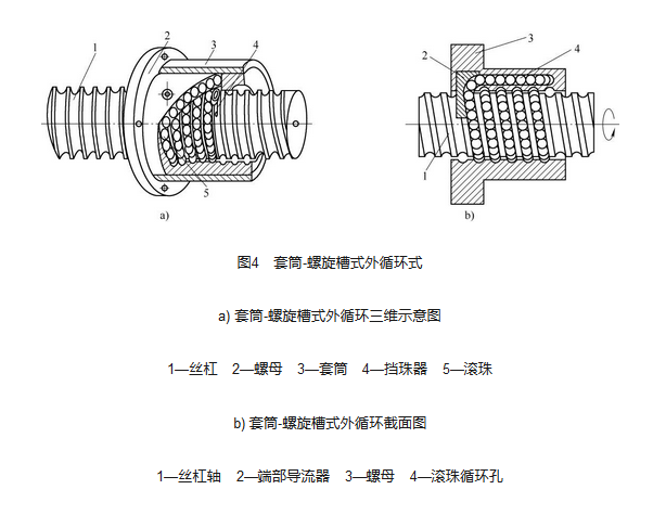 (1) 套筒-螺旋槽式。在滾珠螺母外圓柱面上加工有螺旋形凹槽作為滾珠循環(huán)通道, 凹槽的兩端分別加工有與螺旋滾道相切的通孔, 將兩個(gè)擋珠器(端部導(dǎo)流器) 裝于螺母內(nèi)表面?zhèn)瓤字?span>, 弧形擋珠桿與螺旋滾道相吻合, 桿端部舌形部分將引導(dǎo)滾珠進(jìn)入回珠通孔, 返回初始螺旋滾道, 形成滾珠鏈運(yùn)動(dòng)。為防止?jié)L珠從回珠槽內(nèi)脫出, 用套筒緊套在螺母外圓柱上, 從而構(gòu)成了滾珠鏈的封閉循環(huán)運(yùn)動(dòng), 即套筒-螺旋槽式外循環(huán), 如圖4 所示。 這種形式結(jié)構(gòu)簡單, 螺母外徑較插管式小20% ~ 30%, 軸向排列緊湊, 節(jié)約空間; 有效負(fù)載滾珠多, 承載能力較高; 剛度大, Dn 值最高可達(dá)18 萬; 運(yùn)行噪聲低。與單圈內(nèi)循環(huán)式相比, 該方式工藝性好, 生產(chǎn)不受批量限制, 且單、雙列結(jié)構(gòu)均可采用。一般情況下, 單列優(yōu)于雙列, 只有當(dāng)單列螺母上工作圈數(shù)超過3. 5 圈時(shí)才用雙列; 而雙螺母預(yù)緊時(shí), 最好以兩圈為列(即2. 5 ×1), 但此時(shí)在一列中的滾珠數(shù)比其單圈內(nèi)循環(huán)多, 即滾珠運(yùn)動(dòng)鏈長, 運(yùn)行阻力增大, 且在螺母體上的回珠槽與回珠孔不易準(zhǔn)確平滑連接, 拐彎處曲率半徑小, 滾珠急劇轉(zhuǎn)向時(shí)運(yùn)動(dòng)不平穩(wěn), 從而影響滾珠運(yùn)動(dòng)的流暢性和靈活性, 此外這種形式的滾珠絲杠副螺母徑向尺寸也較大。擋珠器的弧形桿剛度較差, 特別是舌形部分易于磨損, 壽命較短。