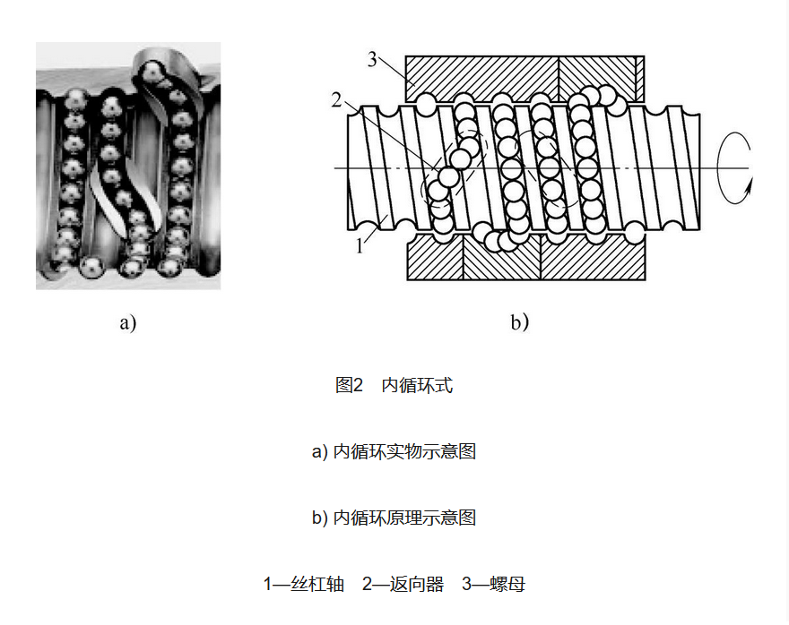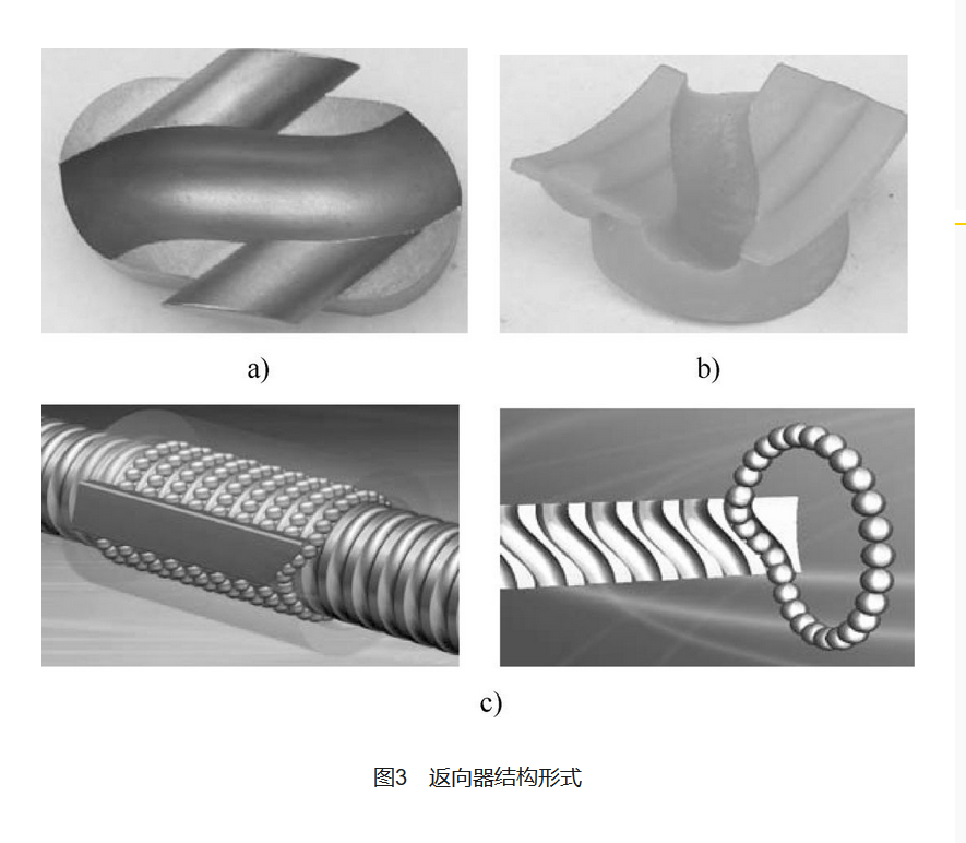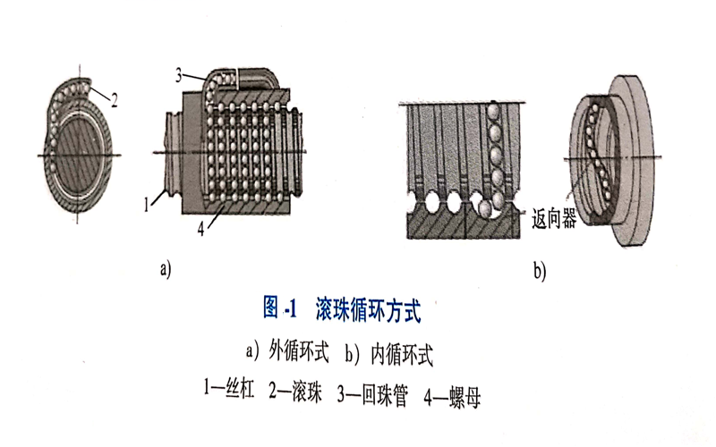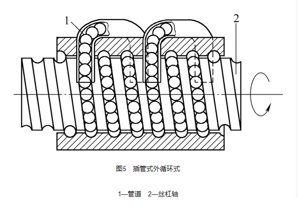 滾珠循環(huán)方式按滾珠在循環(huán)反向過程中與絲杠表面脫離與否, 可分為內(nèi)循環(huán)式和外循環(huán)式, 如圖1 所示。 1、內(nèi)循環(huán)式