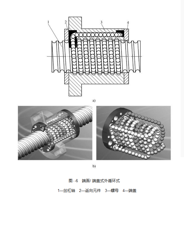 (2) 插管式。如圖5 所示, 插管外循環(huán)式把部分的成形彎管插入螺旋滾道一列工作圈兩端與滾道相切的通孔內(nèi), 以代替套筒-螺旋槽式的凹槽。以插入孔中的彎管端部舌形斜口或另裝其他形式的擋珠器來引導(dǎo)滾珠進(jìn)出彎管以構(gòu)成循環(huán)通道。根據(jù)循環(huán)管組件是否凸出螺母外徑, 插管外循環(huán)又可分為內(nèi)包式和外凸式。插管式的特點(diǎn)是結(jié)構(gòu)簡單, 工作可靠, 工藝性好, 適于批量生產(chǎn), 公稱直徑與導(dǎo)程組合較多, 適用性廣, 回珠管可設(shè)計(jì)、制造成較理想的運(yùn)動(dòng)通道, 且允許絲杠副有較高的臨界轉(zhuǎn)速。相對于套筒-螺旋槽式, 滾珠循環(huán)進(jìn)出回珠孔時(shí)急劇轉(zhuǎn)彎而影響運(yùn)轉(zhuǎn)靈活性的缺點(diǎn)得到了極大改善, 但彎管凸出于螺母外部, 使螺母徑向尺寸增大, 在設(shè)備部件內(nèi)部安裝受了限制, 且彎管本身壁薄而耐磨性差, 當(dāng)利用彎管端部斜口做擋珠器用時(shí), 壽命更短。 目前此類結(jié)構(gòu)應(yīng)用極為廣泛, 并正在逐漸取代套筒-螺旋槽式滾珠絲杠副。由于它適用于重載高速的驅(qū)動(dòng)系統(tǒng), 也適用于精密定位系統(tǒng), 不論大導(dǎo)程、小導(dǎo)程、多線螺紋的滾珠絲杠副, 都顯示出獨(dú)特的優(yōu)越性。國外如日本, 就把插管式外循環(huán)作為普通系列, 而其他結(jié)構(gòu)形式均作為專用系列生產(chǎn)。 (3) 端面/ 端蓋式。端面/ 端蓋式外循環(huán)式結(jié)構(gòu), 如圖6 所示, 是一種在螺母端部配置滾珠返向器, 在螺母內(nèi)設(shè)置貫通孔的循環(huán)方式。在螺母壁厚上鉆有軸向通孔作為滾珠的返回通道, 螺母兩端面裝有返向器, 返向器接口與螺紋滾道相切, 并可引導(dǎo)滾珠進(jìn)入回珠通孔構(gòu)成閉合回路??蔀槎嗑€螺紋, 各自形成一個(gè)滾珠鏈。其特點(diǎn)是: 螺母徑向、軸向尺寸小; 高承載、高可靠性、低噪聲; 滾珠循環(huán)部的加工復(fù)雜。端面式外循環(huán)式結(jié)構(gòu)適用于低承載且速度、精度較高的場合, 或高承載且速度、精度較低的場合; 端蓋式外循環(huán)式結(jié)構(gòu)適用于多線、高承載、低轉(zhuǎn)速、低精度傳動(dòng)行業(yè)的應(yīng)用場合。近年來端面/ 端蓋式外循環(huán)式結(jié)構(gòu)在國內(nèi)逐漸被 廣泛使用。