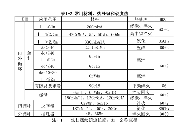 為了滿足滾珠絲杠傳動工作性能和傳動精度的要求,以獲得最長的工作壽命和最高的承載能力,螺紋滾道必須具有一定的硬度,一般為58~60HRC,滾珠硬度一般要求為62~64HRC。對于高溫下工作或用不銹鋼制造的滾珠絲杠傳動,螺紋滾道表面硬度<58HRC為好。對材料的要求是耐磨性好,易切削,而且變形小。如果要進行滲碳溶火處理的,宜采用低碳銘鑰鋼。如果要進行感應處理的,因硬度要求在58~62HRC的范圍內,故應用含碳量為0.4%~0.5%的銘鑰鋼。一般機械特別是數(shù)控機床用的滾珠絲杠傳動各零件材料如圖表1-2所示。精密滾珠絲杠傳動可用氮化鋼。表面硬化的鎳鉻合金鋼滾珠絲杠副,適用于結構和強度有特殊要求的航空機械上。在原子能工業(yè)或高溫、水蒸氣、二氧化碳氣體中工作的滾珠絲杠傳動,由于無法潤滑,故宜采用含馬氏體的鎳鉻合金鋼、沉淀硬化鋼以及可粹硬的鉻鋼較理想。如果要求噪聲小時,可用尼龍滾珠配以鋼制絲杠和螺母。