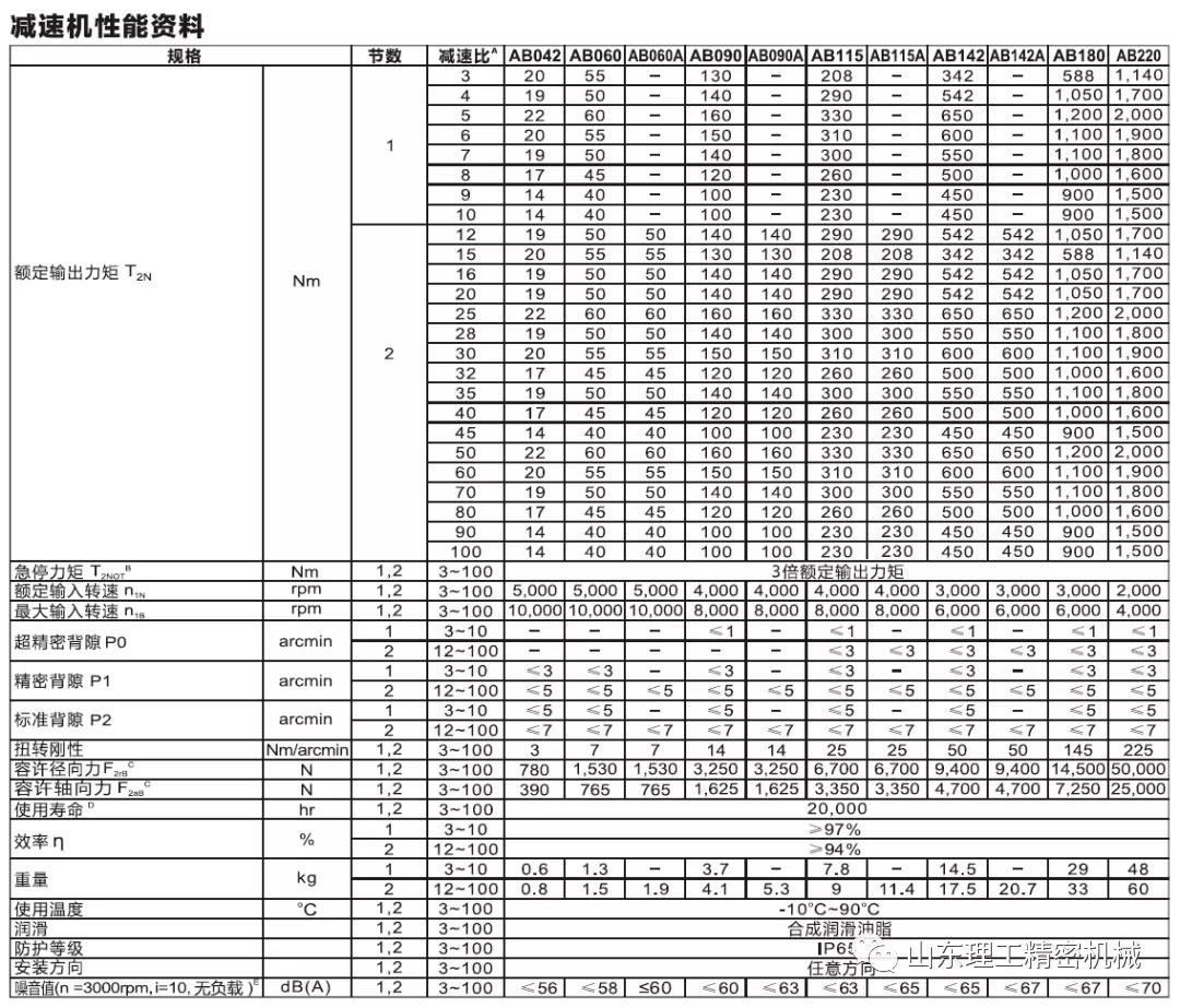 例如上圖的樣本中,減速機的型號為:AB042-單節(jié),我們在選擇的時候,需要注意幾個地方,第一就是看減速機的外形,例如上式中的042,其實外形尺寸為42*42mm,這個時候注意去和你的伺服電機的外形做比較,通常我們選擇外形相當?shù)臏p速機就可以了。